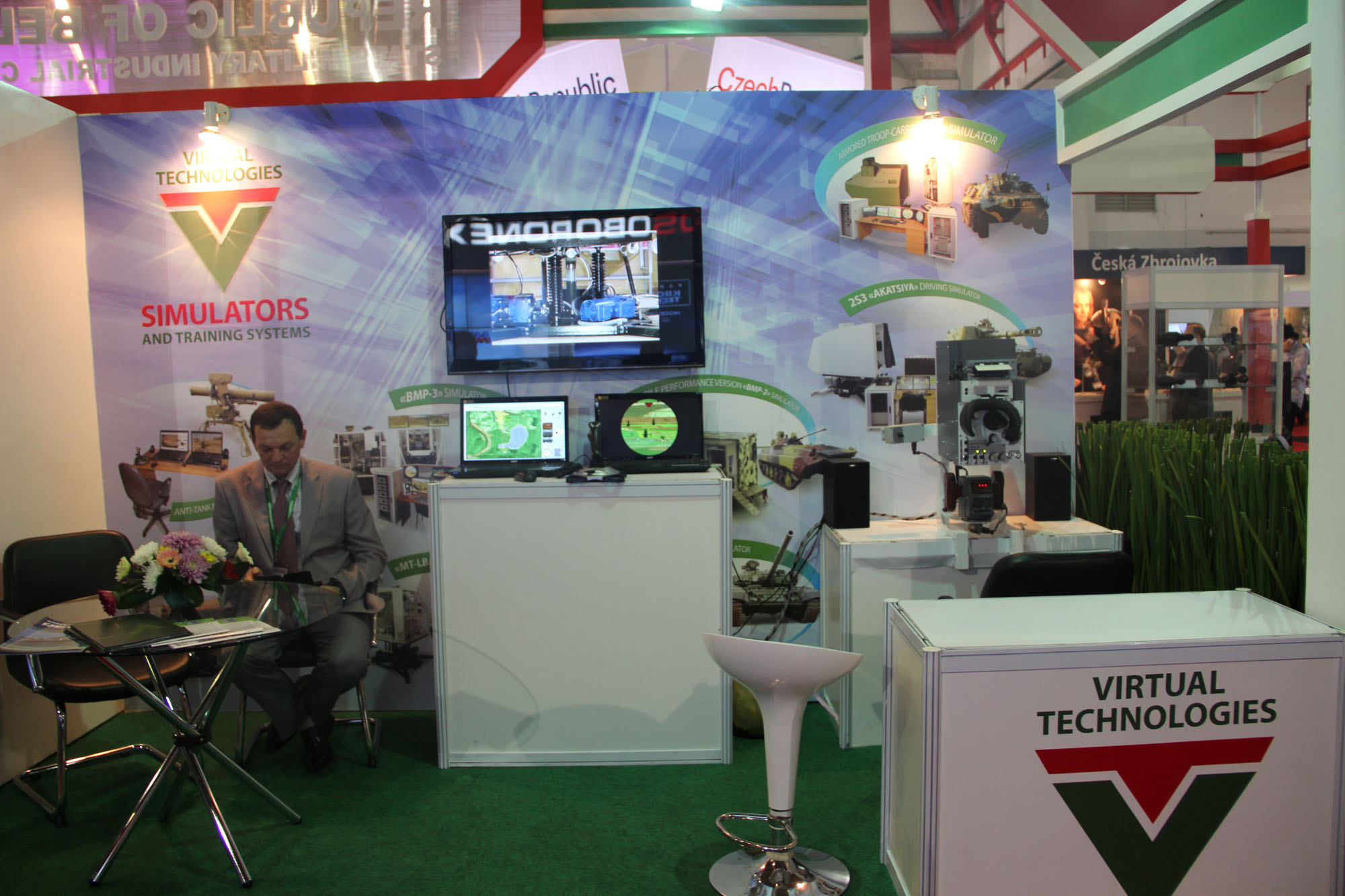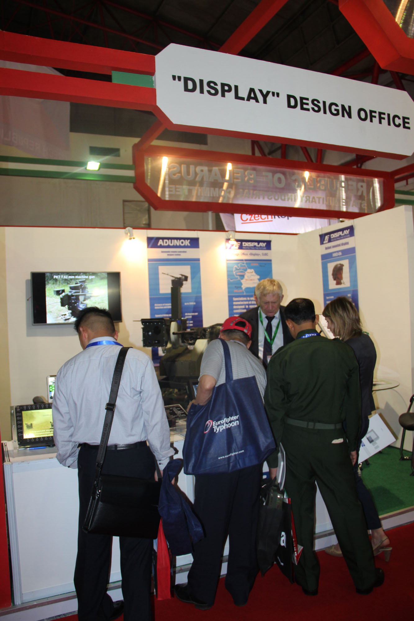 The joint organizer and main exhibitor of the Belarusian joint stand at the show was SFTUE "Belspetsvneshtechnika". In the pavilion,natural samples of optical sights of various types, observation devices, ADUNOK automatic remote controlled weapon station, BMP-3 gunner’s simulator, as well as posters showing the possibility of supply of weapons and military equipment and special-purpose equipment by the enterprise were presented.