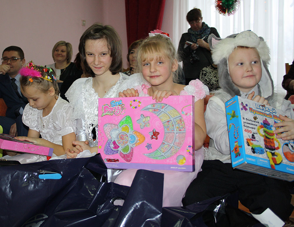 Работниками предприятия за счет собственных средств были приобретены новогодние наборы сладостей, фрукты, мягкие игрушки, книги, фломастеры, акварельные краски, альбомы для рисования и развивающие игры.